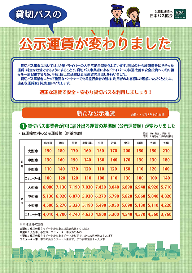 2025年9月26日付 国土交通省により貸切バスの新運賃・料金が公示されました。